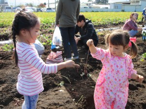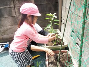 園内の菜園で野菜を育てています。子供達の手で育てた野菜を収穫し、給食でいただきます。