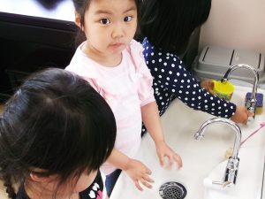 子供達の手洗いはもちろんのこと、子供が触れる場所やおもちゃなどは毎日消毒を行い、消毒液はその都度用途によって変更しています。例えば伝染性の強い風邪が流行っている時などはアルコール液ではなく塩素系のものを使用し、希釈もその都度変更しています。