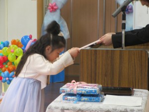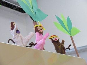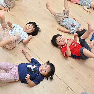 初めは慣れない状況に泣いてしまうお友達もいましたが、英語の先生が読んでくれる英語の絵本や、楽しいリズムダンス・手遊びにとても喜ぶようになりました!「バ~イ!」や「センキュ~!」が上手に言える様になっていますよ!(現在はお休み中です)
